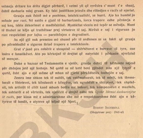 “Nuk do tē kemi kurrë një racë burrash të naltë, gjersa nuk do të kemi një racë të grave të lira – të mëmavet të lira”.