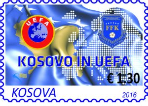 Ne fig.5, imazhi paraqet dy pulla postare të Kosovës, të publikuara në vitin 2016, të cilat shënojnë dy momente historike për sportin kosovar, pranimin e Kosovës në UEFA dhe FIFA. Të dyja pullat kanë dizajn të ngjashëm, ngjyra dominuese është blu, duke përfaqësuar flamurin e Kosovës, dhe përfshijnë simbolet zyrtare të organizatave ndërkombëtare të futbollit. Pulla e majtë, “Kosovo in UEFA”, përmban logon e UEFA-s, bashkë me stemën e Federatës së Futbollit të Kosovës (FFK). Në sfond shihet një harte e Evropës, duke simbolizuar hyrjen e Kosovës në strukturat evropiane të futbollit, njohjen ndërkombëtare, rol të barabartë në arenën sportive të Evropës. Pulla e djathtë, “Kosovo in FIFA” përmban logon e FIFA-s, bashkë me stemën e FFK-së. Pulla tregon pranimin e Kosovës në organizatën më të madhe botërore të futbollit, njohjen zyrtare në nivel global, hapjen e dyerve për garat ndërkombëtare, eliminatoret, turnetë botërorë etj.