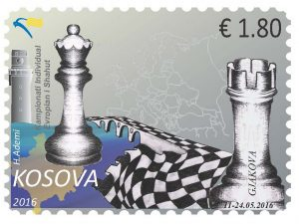 Në fig.7 paraqitet një pullë postare e Kosovës, e dedikuar për “Kampionatin Individual Evropian të Shahut – Gjakova 2016”. Elementet kryesore të pullës jane figura e Mbretëreshës dhe Kullës, që simbolizojnë lojën e shahut, dhe fusha e shahut me ngjyra bardh-e-zi. Në bllokun filatelik nga e djathta shihet kompozimi i 2 pullave, bashkë me ilustrime të qytetit të Gjakovës (urë dhe kullë).Ky emision ka interes për koleksionistet, ne temat e sportit apo shahut ne vecanti.